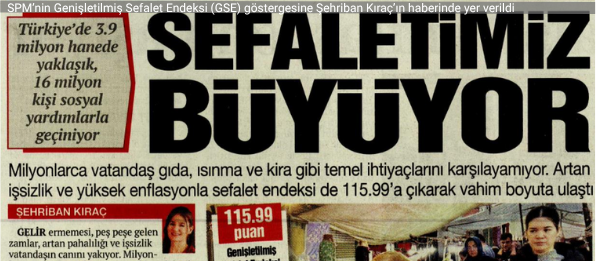 Geleneksel Sefalet Endeksinin arkasındaki kavramlaştırmayı genişleterek her ay düzenli olarak hesapladığımız ve SPM Ekonomik Zorluk Analizi Bülteni aracılığıyla duyurduğumuz Genişletilmiş Sefalet Endeksinin (GSE) hem toplumun yaşadığı ekonomik zorlukların hem de işgücü piyasasındaki iş bulma sorunlarının seyrini daha yakından ve gerçekçi biçimde izleme imkanı verdiğini düşünüyoruz. [Devamı] [İndir]